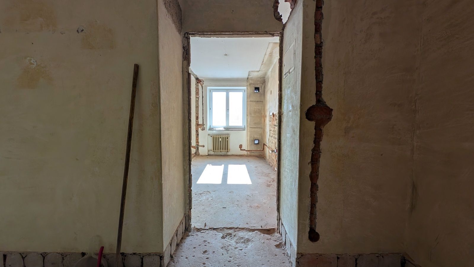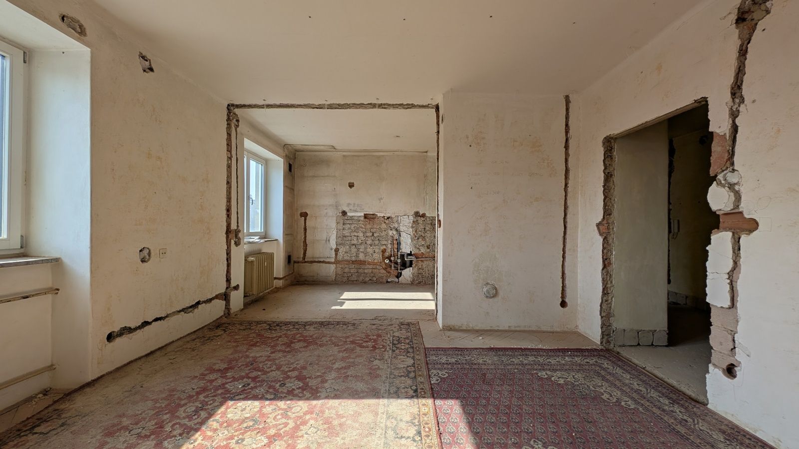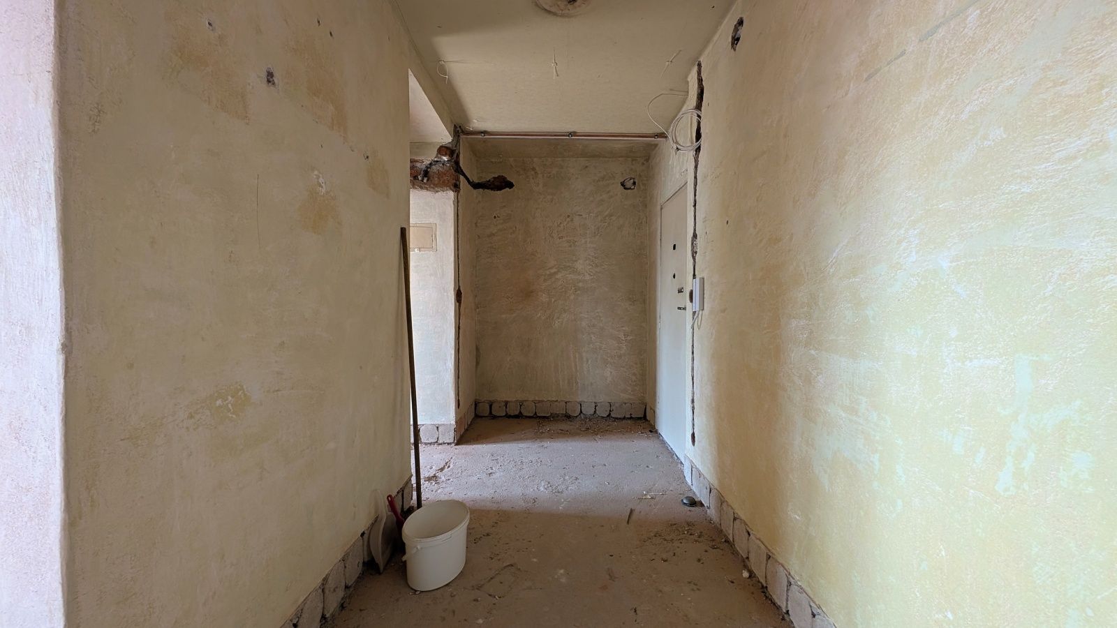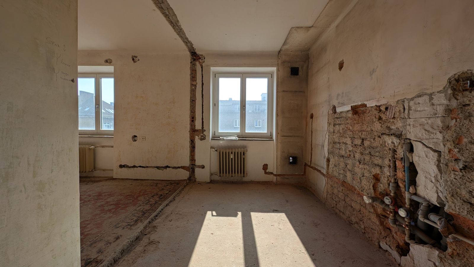 Byt 2+1 o výměře 56,8 m² v 5. nadzemním podlaží. Jednotka je ve velmi špatném technickém stavu – odstraněné části interiéru, odkryté konstrukce – a je určena k celkové rekonstrukci.