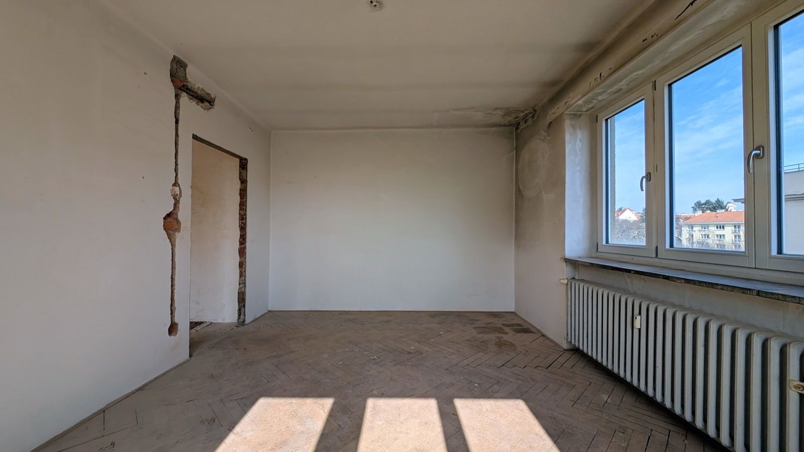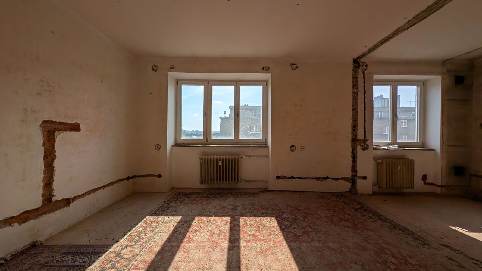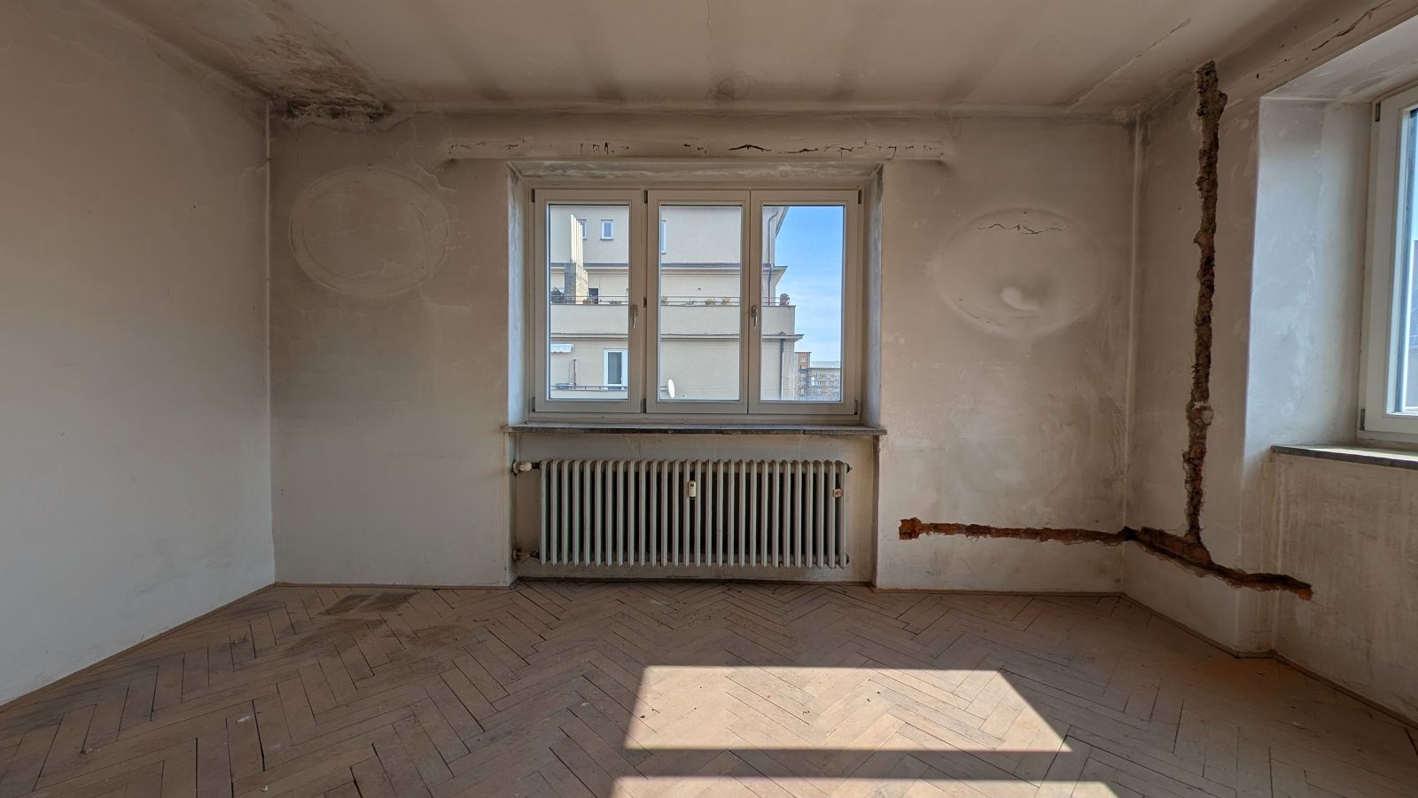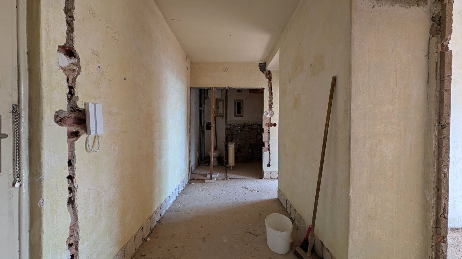 Byt 2+1 o výměře 56,8 m² v 5. nadzemním podlaží. Jednotka je ve velmi špatném technickém stavu – odstraněné části interiéru, odkryté konstrukce – a je určena k celkové rekonstrukci.