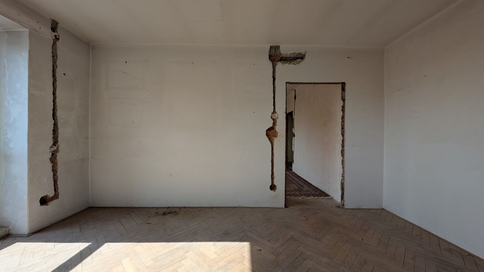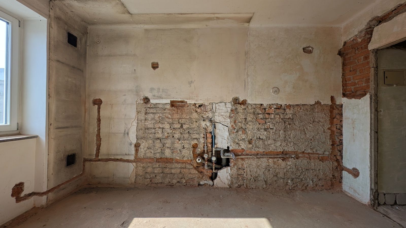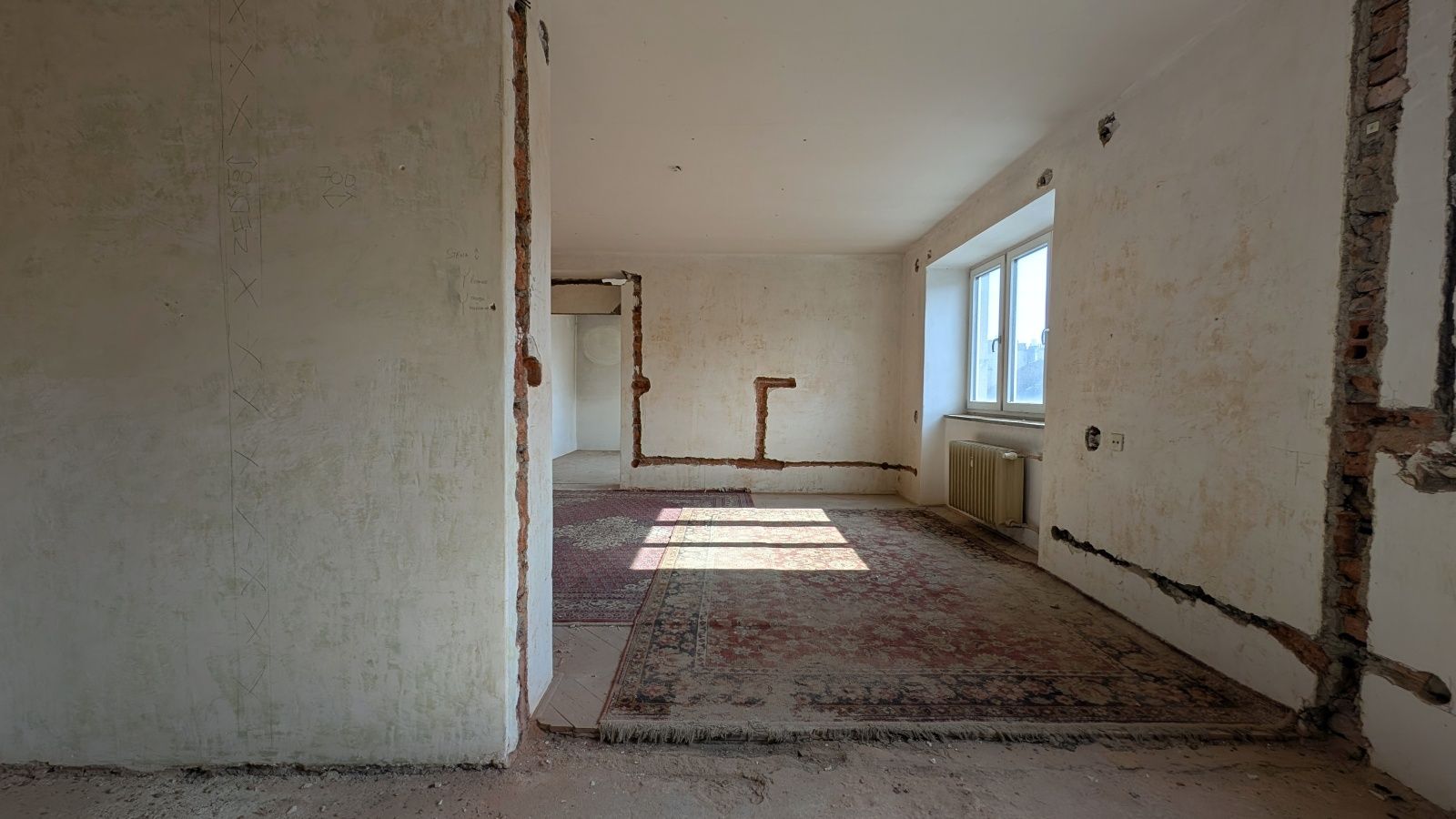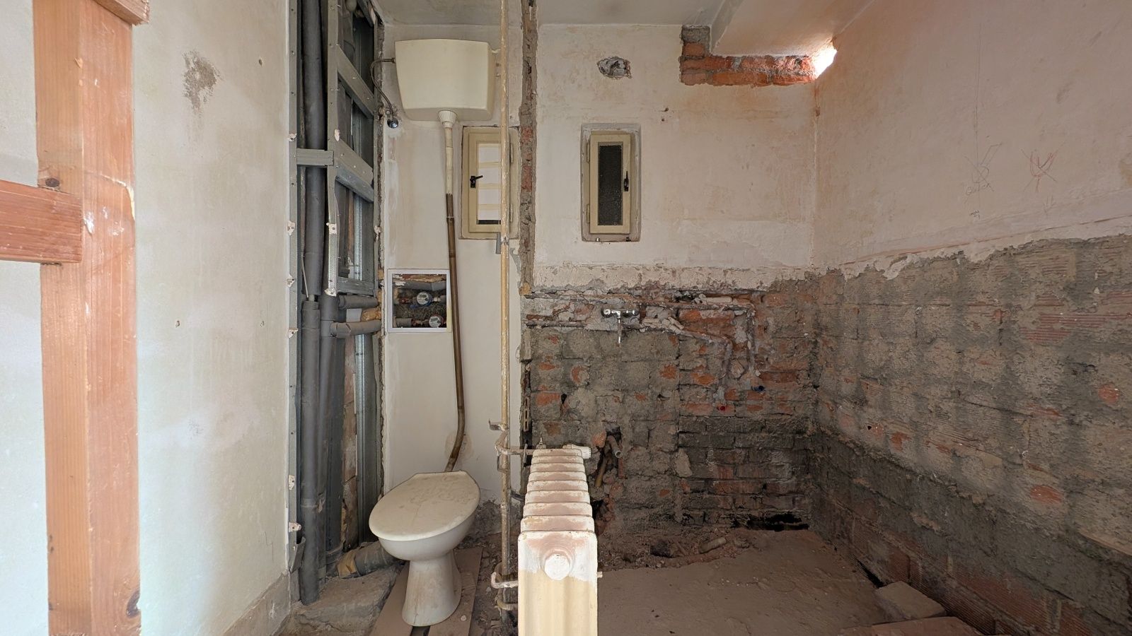 Byt 2+1 o výměře 56,8 m² v 5. nadzemním podlaží. Jednotka je ve velmi špatném technickém stavu – odstraněné části interiéru, odkryté konstrukce – a je určena k celkové rekonstrukci.